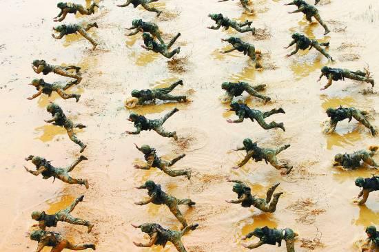 2012年6月5日,广东东莞,特战队员们在泥水中进行捕俘训练。CFP供图(资料图片)