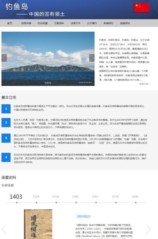 2014年12月30日,钓鱼岛专题网站正式上线开通。该网站由国家海洋信息中心主办,使用“”和“www。钓鱼岛.cn”域名。国防大学战略研究部教授梁芳在接受人民网采访时表示,要通过该网站向世界宣布钓鱼岛历来属于中国,同时揭露日本极右政府的战略野心。