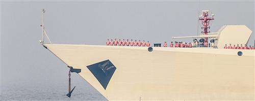 052D型导弹驱逐舰的2号舰缓缓驶离船厂码头,驶向大海。舰上的人员在甲板上整齐列队,向船厂致意