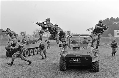 第13集团军某团坚持从难从严组织实战化训练。图为1月4日该团开训动员现场,侦察兵搭乘突击车向“敌”阵地发起冲击的场景。刘 勇摄