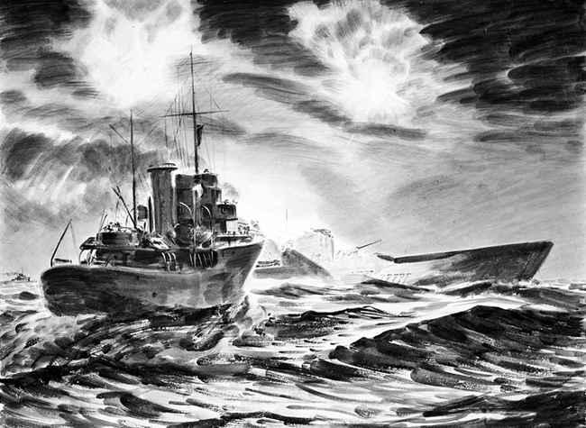 “奇异鸟”号扫雷艇撞击日本潜艇。