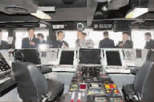 在宽敞明亮的驾驶室内,自动航行控制仪、电子地图、导航雷达等各种系统设备都通过数据总线连接到中部控制台,来自动力系统、通信系统和卫星定位系统的数据则显示在后部控制台上。据“坚决”号的军官介绍,依靠这些先进的航电系统,平时驾驶“坚决”号只需3人即可完成操作。为了提高可靠性,“坚决”号还有一整套备用航电系统,当一套出现故障,另一套马上能投入运行。