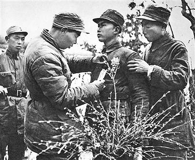 晋察冀军区第一军分区政治部主任罗元发为宋学义(右二)授勋章。 作者提供