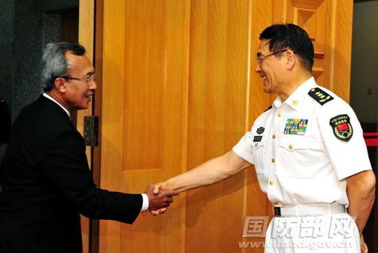 中新网5月18日电 据国防部网站报道,5月18日下午,副总参谋长孙建国海军上将在八一大楼与来访的马来西亚国防部秘书长拉希姆共同主持第二届中马防务安全磋商。(李晓伟摄)