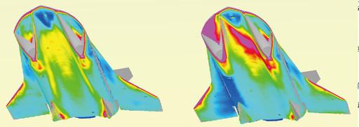 风洞试验结果显示:超燃冲压发动机不起动(右)会导致表面温度升高。