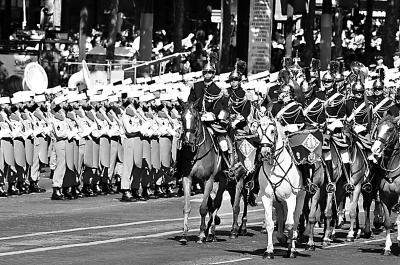 穿行在花都百年的古典建筑和青山绿水之间,就算是坚甲利炮也沾染了几分艺术气息。将武器设计得美轮美奂本来就是法国人的爱好,而他们又以艺术的眼光将各种不同类型的装甲车辆进行混编,或者对车辆方队巧妙排序。各种大小不一的坦克和战车匀速行驶在美丽的香榭丽舍大街上,偶尔上空还掠过一队法兰西巡逻兵表演队的飞机,在蓝天上拉出红蓝白国旗色图案。这样的艺术化阅兵,或许只能为浪漫的巴黎和捍卫它的法兰西共和国军队所独有。(魏岳江)