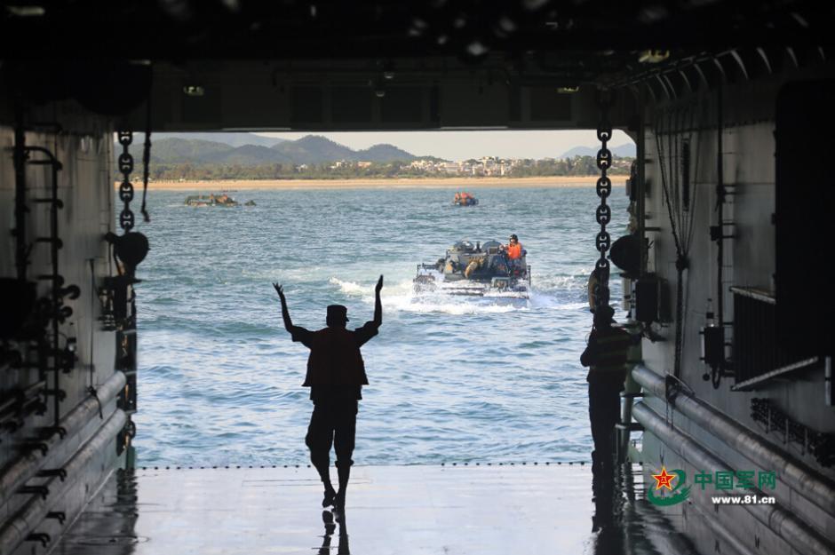 资料图:海军陆战队某旅在登陆舰的配合下进行两栖装甲装备海上浮渡装卸载训练。