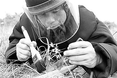 绑腿、束腰、戴盔……尽管动作熟练,再加上两名战友的协助,中士江辉华穿上这身“铠甲”,还是足足用了5分钟。检查完穿戴后,他蹒跚着走向未爆弹。