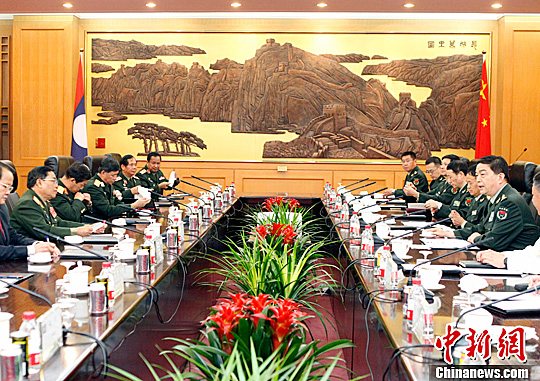 中新社北京7月8日电 (记者 陶社兰)中国国务委员兼国防部长常万全8日下午在北京八一大楼与老挝国防部长森暖·赛雅拉举行会谈。