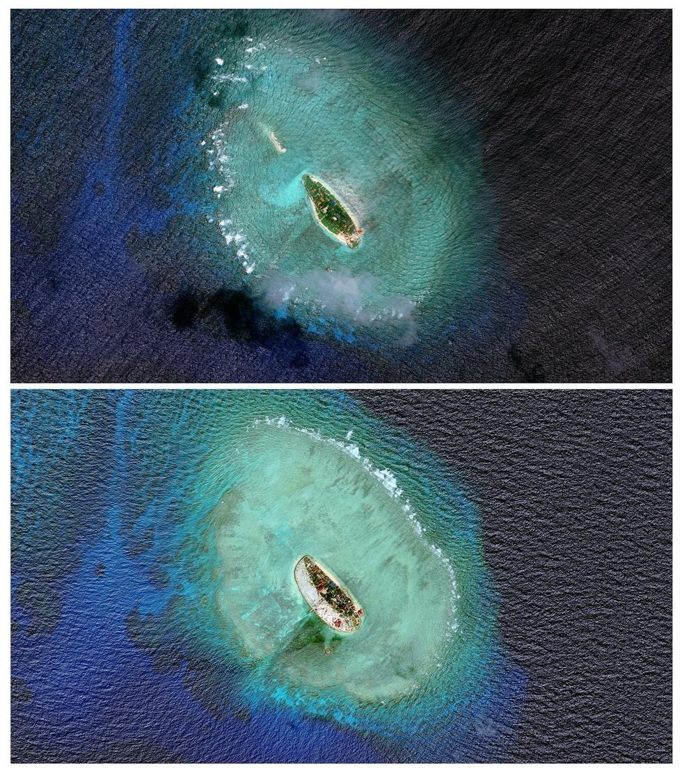 越南在侵占的南沙敦谦沙洲进行填海造陆。上图为2011年拍摄,下图为2015年拍摄。
