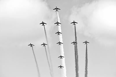 今年7月14日,“法兰西巡逻兵”飞行表演队队员驾驶的12架飞机,在巴黎上空拉出法国国旗蓝、白、红三色彩烟,揭开了阅兵式序幕。它象征着“自由、民主、博爱”,体现了法国人民勇敢、浪漫的传统和对未来美好的愿望。实际上,法国的航空表演活动历史悠久,是国际上公认的老牌航空表演大国。12架飞机在巴黎上空排成洛林十字架队形,在检阅台上空呼啸而过。洛林十字架是戴高乐将军领导的抵抗纳粹的自由法国运动标志。