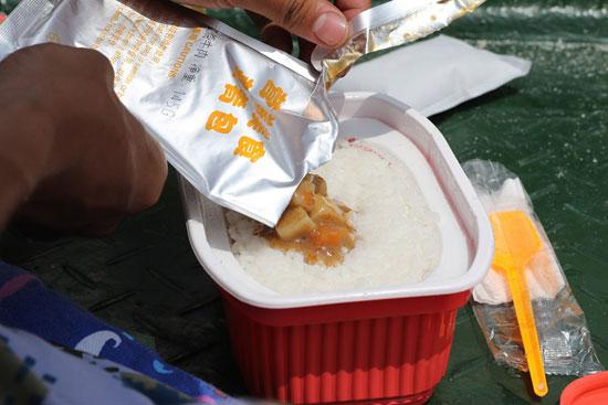队员们的午餐由面包加火腿肠变成了自热餐盒,有宫保鸡丁、红烧牛肉等4种口味可供挑选。