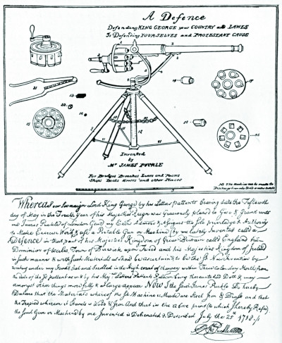 1718年5月,英国人詹姆斯派克为自己设计的枪申请了专利。这支名为“派克枪”的单管、打火石引燃的火枪架在一座三脚架之上,利用一个旋转圆筒,一分钟能发射9发子弹。派克还提供了两种可替换的枪管,方形枪管能发射方形的子弹。