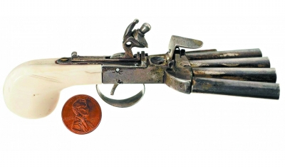 鸭脚手枪以其指向不同方向的3个枪管“形似鸭掌”而得名,登峰造极的可增加到8管。这种武器的历史可以追溯至1810年,按当时来说,是相当具有创新的设计。其目的是很明显地告诉你,一次触动扳机就能多弹齐射,运气好的话一枪能同时干掉多个目标。