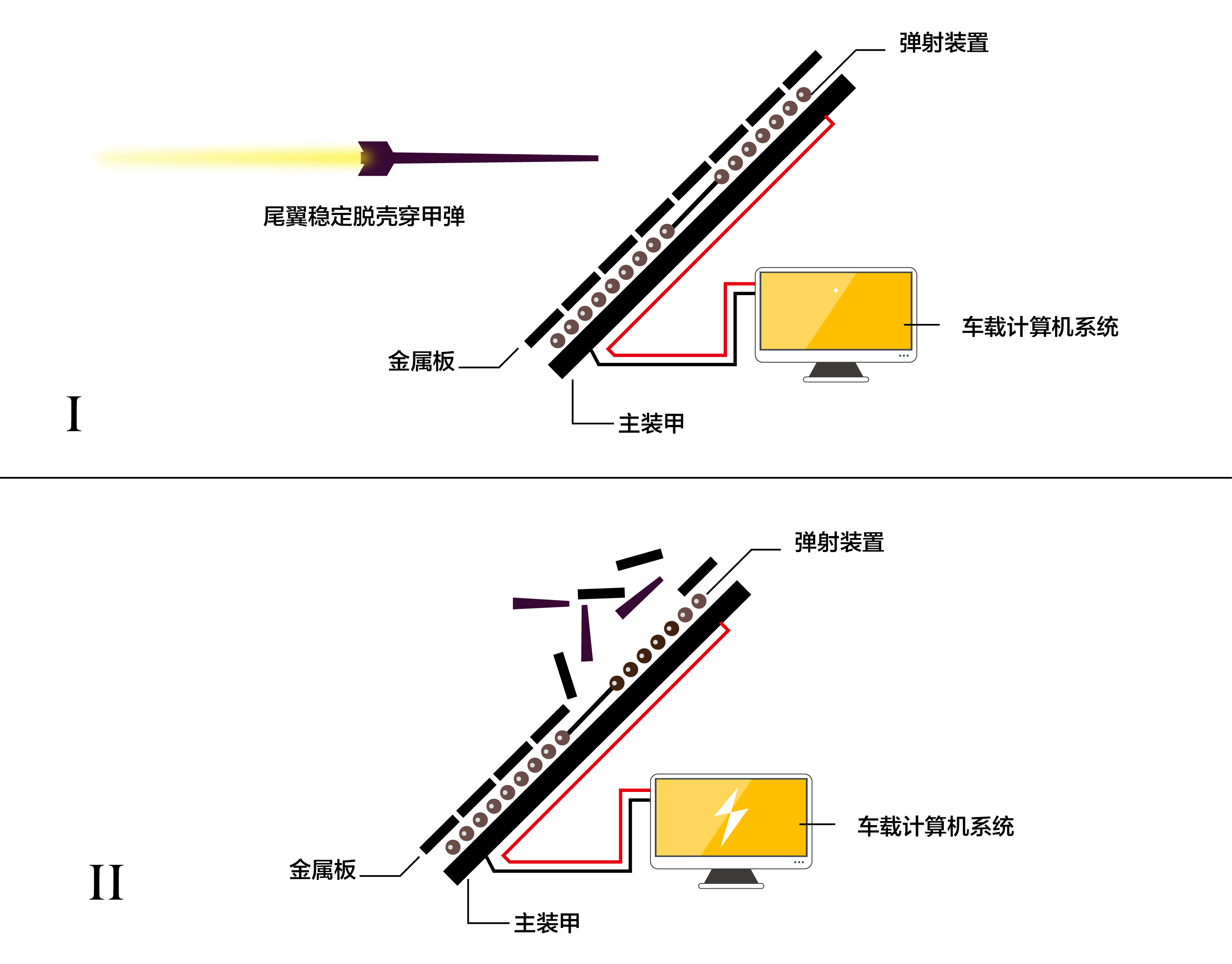 当炮弹袭来,车载计算机系统会控制对应位置的弹射装置弹射出金属板,在炮弹还没有接触到主装甲时摧毁来袭炮弹,或干扰其飞行轨迹,使其偏离方向