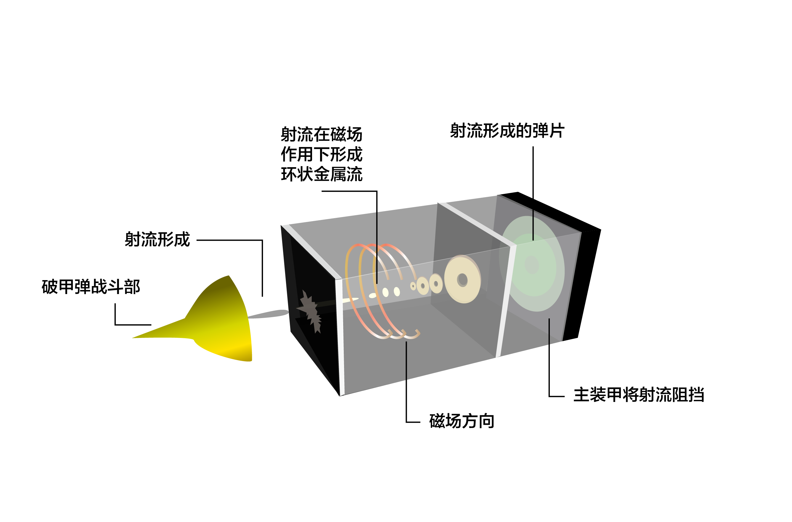 当来袭炮弹产生的金属射流进入电磁装甲内部后,装甲内会立刻产生一个垂直于射流方向的磁场,使金属射流改变运动方向,在装甲内部形成环状运动,最终变为环状或圆形金属片被阻挡在主装甲外