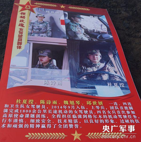 在兰州军区第47集团军通信团,有4名女兵成为兰州军区高原使命课题训练进行3年以来的首批女驾驶员。在海拔3000多米的高原戈壁和崇山峻岭之间,她们驱车千里,征服昆仑。