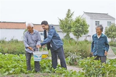 9月30日,蒋岳(中)来到张朝顺父母家,帮助张家二老在菜园浇水。唐明刚摄