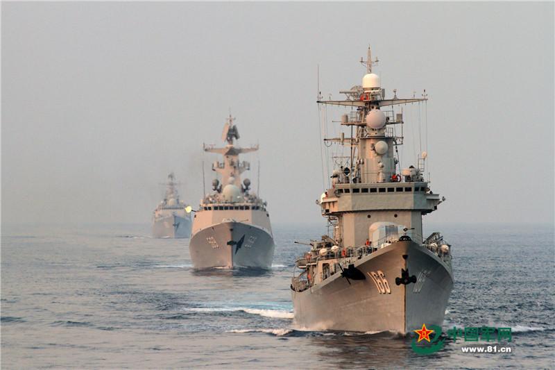 中国海军南海舰队某驱逐舰支队舰艇编队在某海域开展高强度实兵实弹对抗演练。
