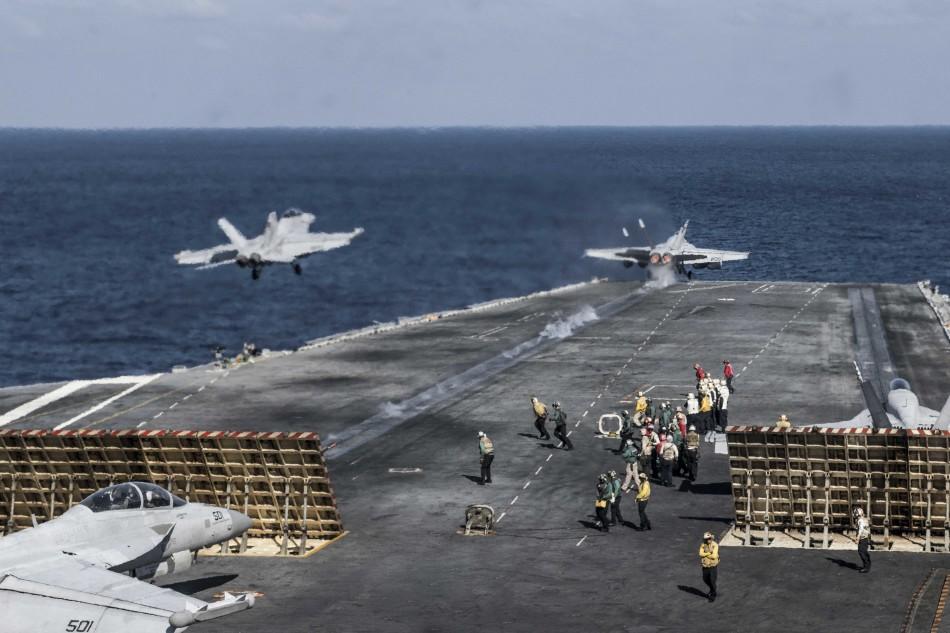 美国海军“里根”号航母战斗群在中国南海附近进行实战训练。