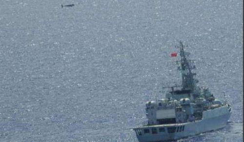资料图:日本自卫队拍摄的中国海军舰队上空的无人机。