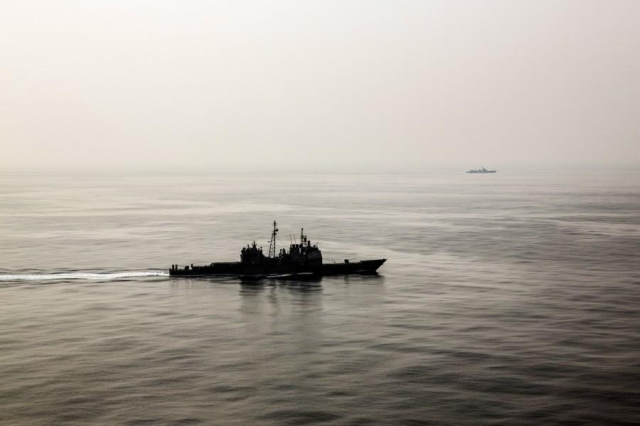中国海军战舰监视美国宙斯盾巡洋舰。