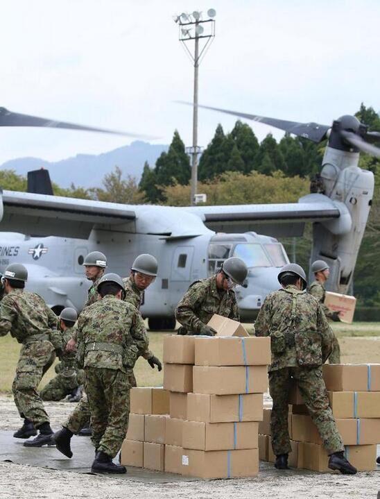 另一方面,日本首相安倍晋三在政府紧急灾害对策总部会议上表示:“鱼鹰与自卫队协作为灾区运送食物、水等救援物资。向美国的友情表示衷心感谢。”