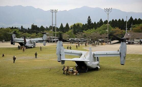 参与救灾的4架“鱼鹰”17日从普天间机场飞抵岩国基地。其中2架18日下午3点半左右离开该基地,在陆上自卫队高游原分屯地装载物资后,于当天下午5点多抵达南阿苏村。
