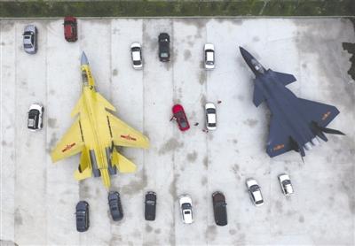 6月6日,在成都温江芙蓉大道附近的一处停车场里,摆放着一架歼15和一架歼20模型
