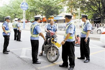 茂名市执勤民警查处摩托车驾驶员违法悬挂涉军假号牌。刘国杰摄