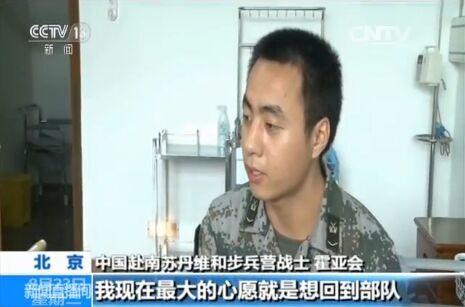 中国赴南苏丹维和步兵营战士 霍亚会:我现在最大的心愿就是想回到部队,重返战斗岗位,用优异成绩回报祖国和人民。