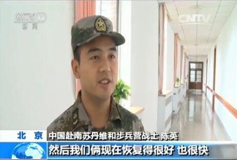 中国赴南苏丹维和步兵营战士 陈英:经过1个多月时间的治疗,我们俩恢复的很好,也很快,特别感谢陆院的医生和护士,这段时间对我们的照顾和无微不至的关怀。