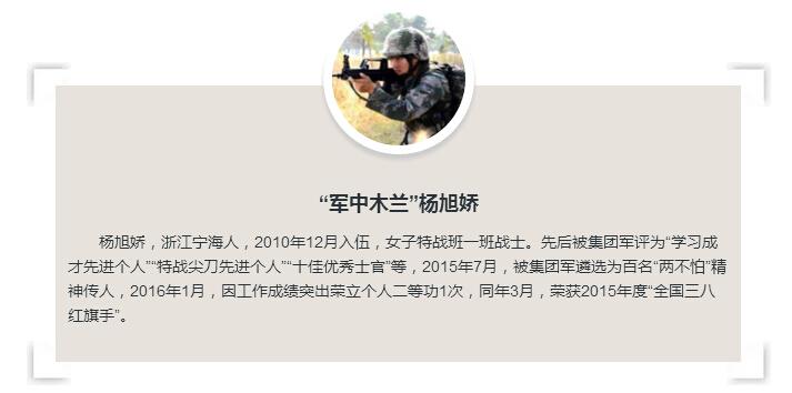 尽管做好了心理准备,可集训强度还是远超杨旭娇的想象。练捕俘技术,她每天摔打几十次,全身到处是擦伤,片片青紫;练崖壁攀登,她在10米长的攀登绳上反复攀爬,时间长了,手心磨掉了皮,露出了肉,又长出了茧……艰辛的付出带来收获的喜悦,杨旭娇的特战技能飞速提高。集训考核中,她各项课目成绩均名列前茅,5000米泅渡更是获得了第二名,被评为“特战尖刀先进个人”。从那时起,杨旭娇“军中木兰”的称谓就开始传遍整个集团军。
