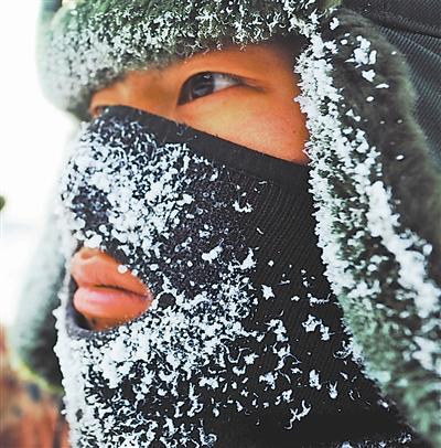 寒冷天气里,官兵的防寒面罩上结满白霜