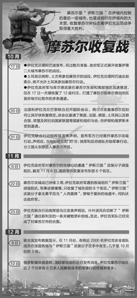 近两年来,伊拉克政府军、库尔德武装在国际反恐联盟的支持下,先后夺回了提克里特、基尔库克、拉马迪等具有重要战略意义的城市,并在今年6月收复了距首都巴格达仅50公里的费卢杰。10月17日,伊拉克总理阿巴迪宣布发起摩苏尔收复战,10月31日,政府军对摩苏尔发起总攻的战役拉开序幕。目前,伊拉克军队和反恐部门正在对摩苏尔北部和东部进行突击,并已进入东部的数个街区。伊拉克警察部队则向城市南部推进。什叶派民兵负责将恐怖分子从具有战略意义的泰勒阿费尔清除,并切断摩苏尔极端分子的补给线。