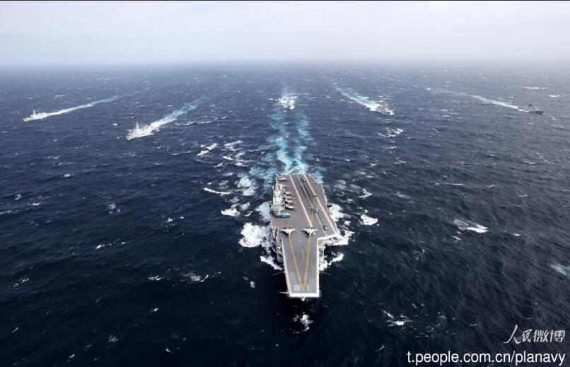 中国海军官方微博曝光辽宁舰舰艇编队远海训练的画面。