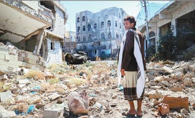 2016年11月22日,也门政府军与胡塞武装冲突致超过40人丧生,塔伊兹街道废墟遍地。