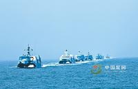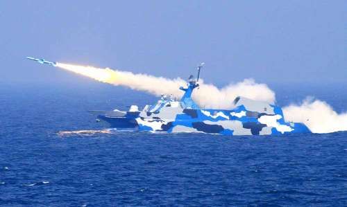 新型022级隐形导弹艇在演练中发射反舰导弹攻击海上目标。