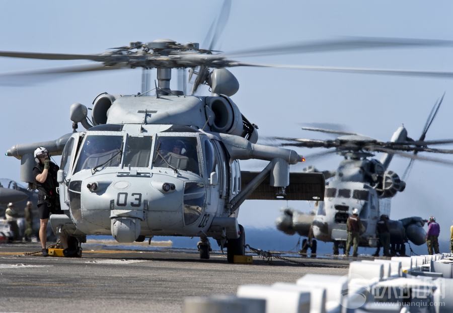 一架MH-60S海鹰直升机和CH-53E直升机准备从好人理查德号上起飞