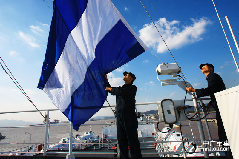 “和平方舟”号医院船信号兵升旗 琚振华摄