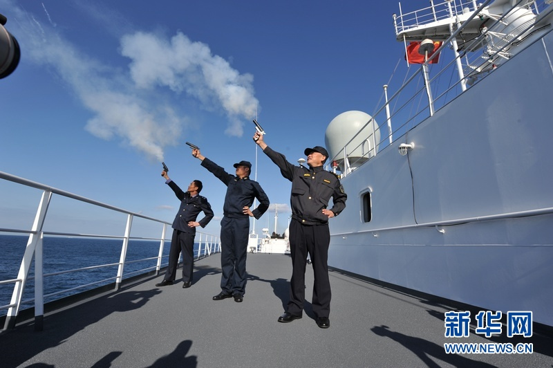 海军、海监、渔政部门人员共同发射信号弹。“东海协作—2012演习”军地海上联合维权演习正式开始。虞起正 摄