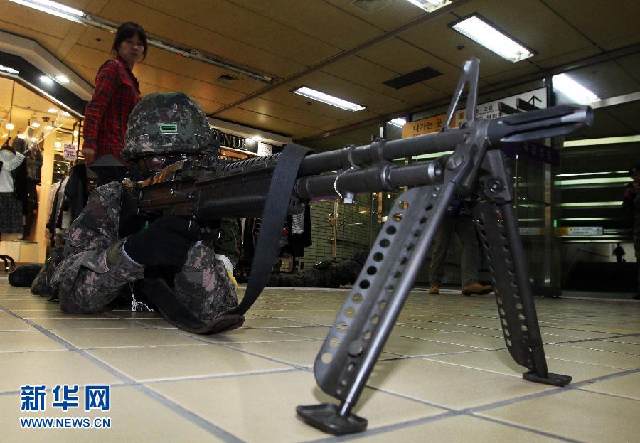 10月25日,一名韩国士兵在首都首尔参加“护国演习”。当日,韩国开始实施一年一度的“护国演习”,演习范围覆盖韩国全境,旨在增强陆、海、空三军相互间的协同作战能力。 新华社发(朴真熙摄)