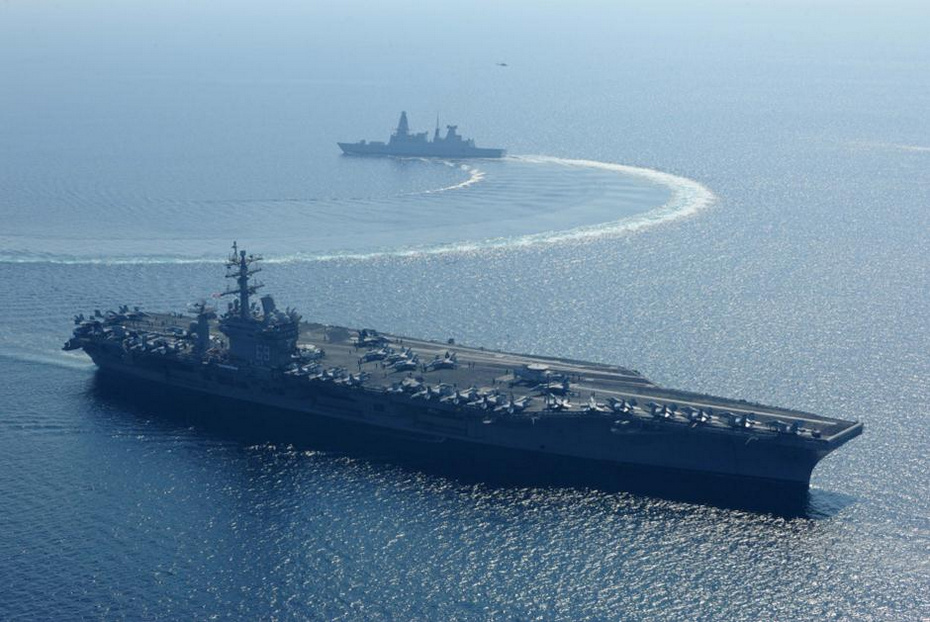 美军CVN69号核航母与英军45级隐身战舰共同执勤
