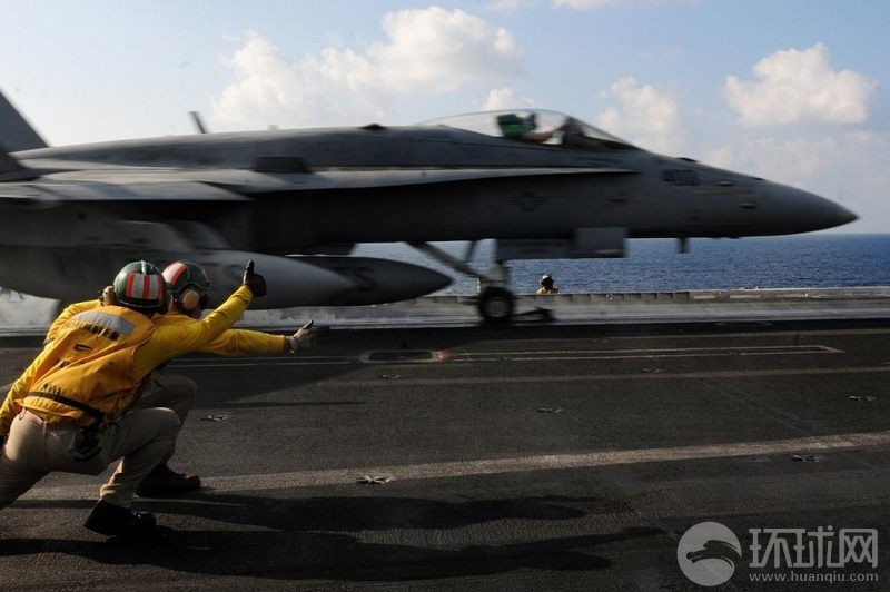 美国航母上起飞指挥官指挥舰载机起飞时的场景