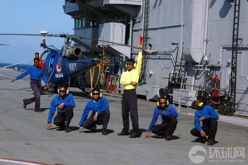 印度航母上的起飞指挥官引导舰载机起飞时的动作