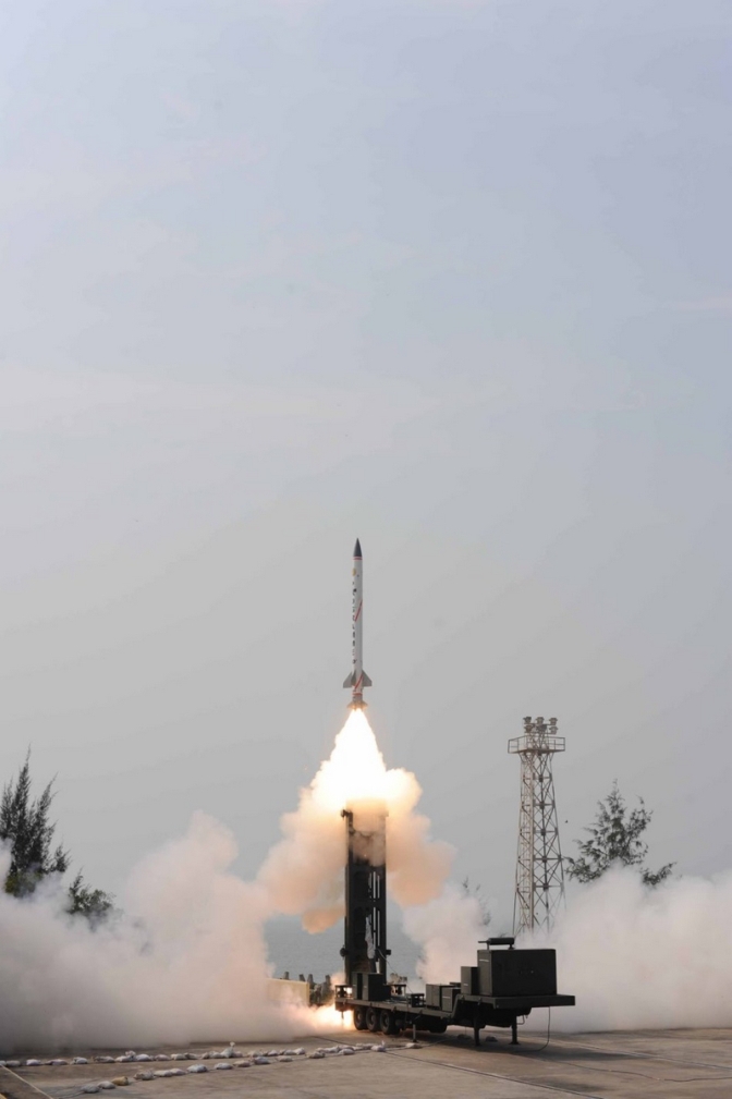 2012年11月23日,印度国产先进的拦截导弹AAD missile进行反导测试。该试验获得成功,AAD拦截弹成功将高速飞行的靶弹击落。(来源:新华网)