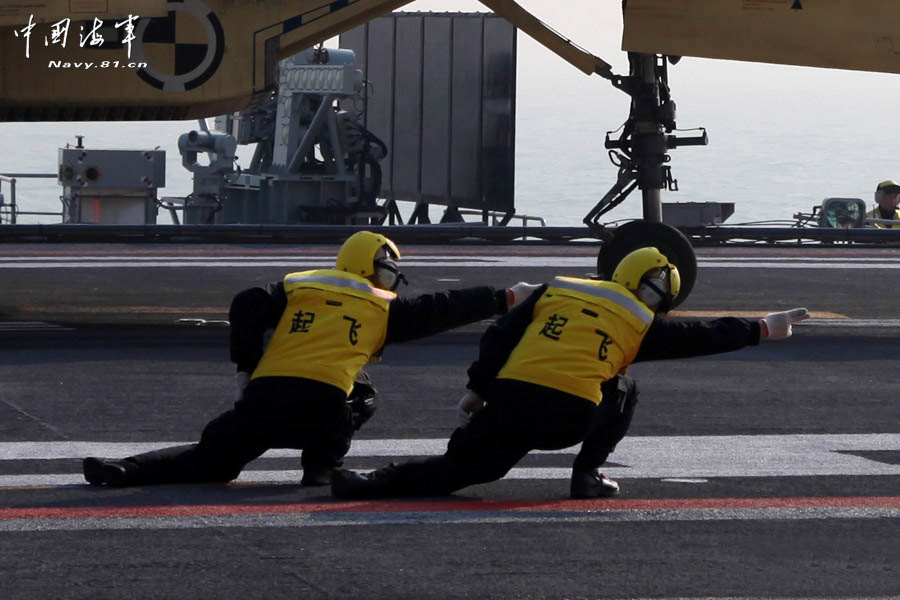 歼-15舰载战斗机从海军辽宁舰起飞位滑跃起飞 李 唐 摄