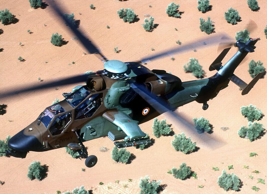 资料图:欧洲“虎”式直升机。该机有护航和火力支援型及反坦克型两种。护航和火力支援型装一门 30 毫米自动机炮,备弹 150 ~ 450 发,另外可带多达 68 枚火箭,减少火箭弹携带量可带 4 枚空空导弹用于自卫。反坦克型可带 8 枚霍特 2 反坦克导弹和 4 枚空空导弹。