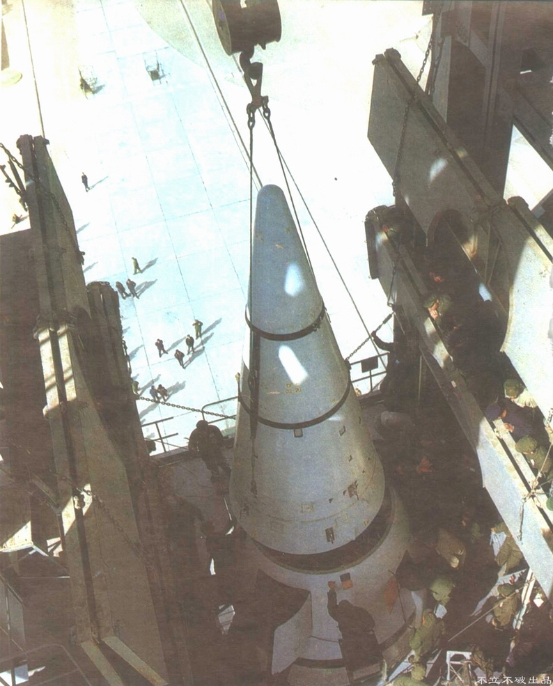 二炮部队官兵为东风5战略导弹加装战斗部,东风5弹头重量估计在3100千克左右。(资料图)