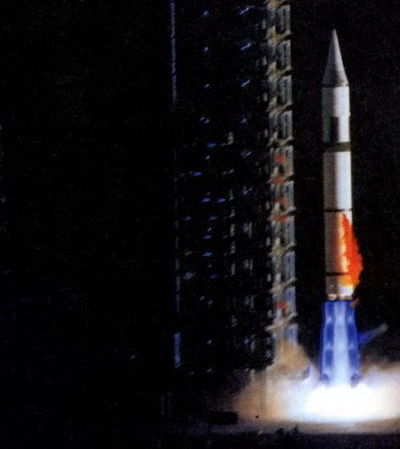东风五号发射图,可见N2O4/UDMH燃烧所释放的棕红色烟